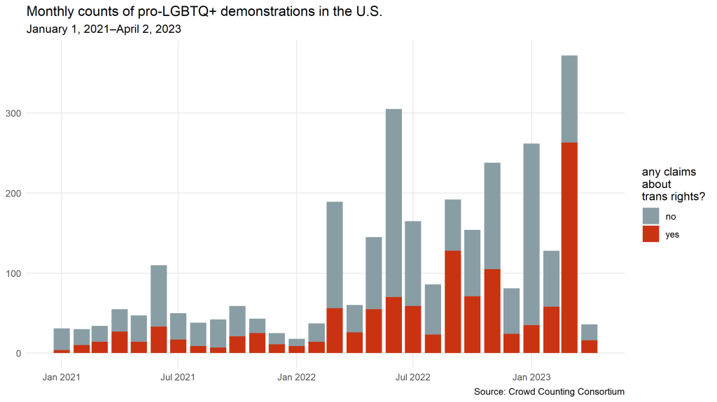 In addition to tracking information about things like an event’s date and location and crowd size, CCC tries provide a more complete and nuanced picture of what each event was “about” by recording verbatim claims from participants’ signs and banners and chants as seen in photos or video or reported by journalists in their write-ups. By far the most common claim at the 2023 events from which we’ve seen participant claims so far was “Trans rights are human rights” (26 events), followed closely by “Protect trans kids” (13) and “Protect trans youth” (11), then “Trans lives matter” (5), “Black trans lives matter” (5), “Protect trans lives” (5), “Respect existence or expect resistance” (4), and “Trans liberation now” (3). In total, we have recorded more than 320 unique claims from these events so far, and we expect that count to grow as we see new articles, videos, or social media posts about this year’s actions. Some of my personal favorites from the long tail of claims we’ve seen once or twice so far include “The trans agenda is an average life expectancy”, “Fuck your gender roles”, “Girls will be boys”, “Keep your bills and bans off queer trans bodies”, “More glitter less bitter”, “No more dead trans women”, “Our joy is radical”, “The future is fluid”, “This body is my creation”, and “Stop trans genocide”.