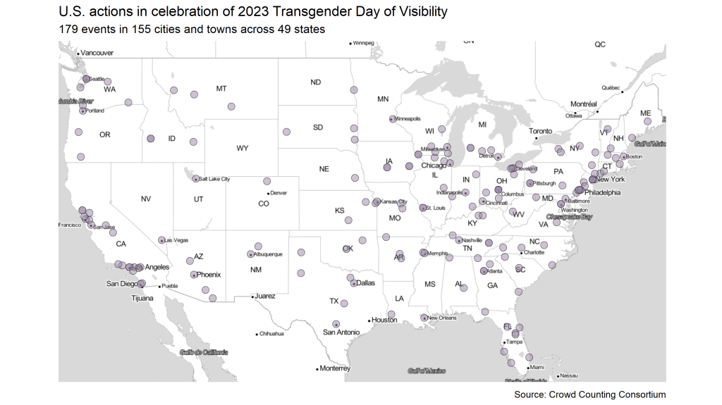 Each year since 2009, people around the world have gathered on March 31 (or close to it) to mark International Transgender Day of Visibility (TDOV). In 2023, the U.S. saw nearly 180 TDOV events in 155 different cities and towns across 49 states, according to data collected so far by Crowd Counting Consortium (CCC). That’s up from just 15 events in 2022 and almost certainly the largest and broadest celebration of TDOV in history.
